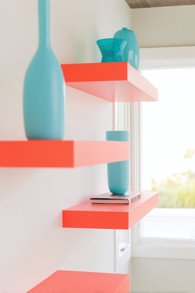 Picture open shelving painted in a striking coral hue against a neutral wall. Display books, decor, or everyday essentials in a curated, colorful arrangement. The vivid backdrop makes everything pop, creating a lively display. It’s like having a gallery of your favorite objects right in your living room.