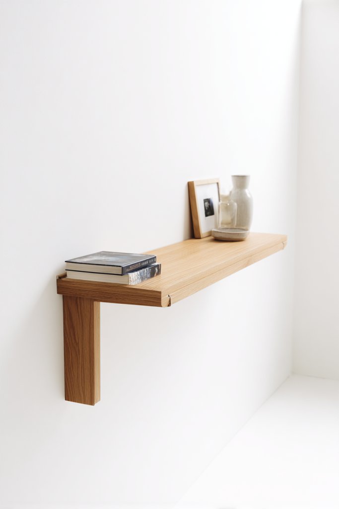 Imagine a narrow wooden plank mounted seamlessly to the wall with hidden brackets, creating the illusion of a floating surface. The natural or painted wood adds warmth and texture, contrasting with smooth painted walls. Accessories like framed photos, candles, or sculptural objects sit confidently on the shelf, adding layers of visual interest.