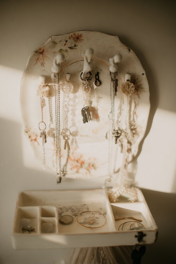 Envision a vintage plate or tray decorated with hooks, clips, or small containers, all mounted on a wall or placed on a table. It’s decorated with paint, decals, or fabric for a personalized look. Keys hang in one spot, necklaces drape over hooks, and bracelets are organized in small compartments. The arrangement is both functional and charming.