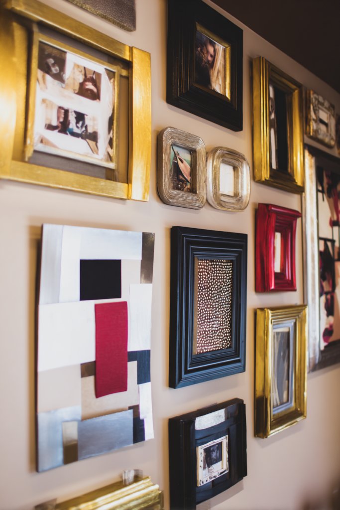 Picture a wall filled with mismatched but harmonizing frames in various shapes and sizes, all painted in bold hues or metallic finishes. Inside, you insert your favorite photos, abstract prints, or even fabric swatches. The arrangement feels lively yet curated, with textures and colors playing off each other. Soft lighting highlights the collection, creating a gallery-like ambiance.
