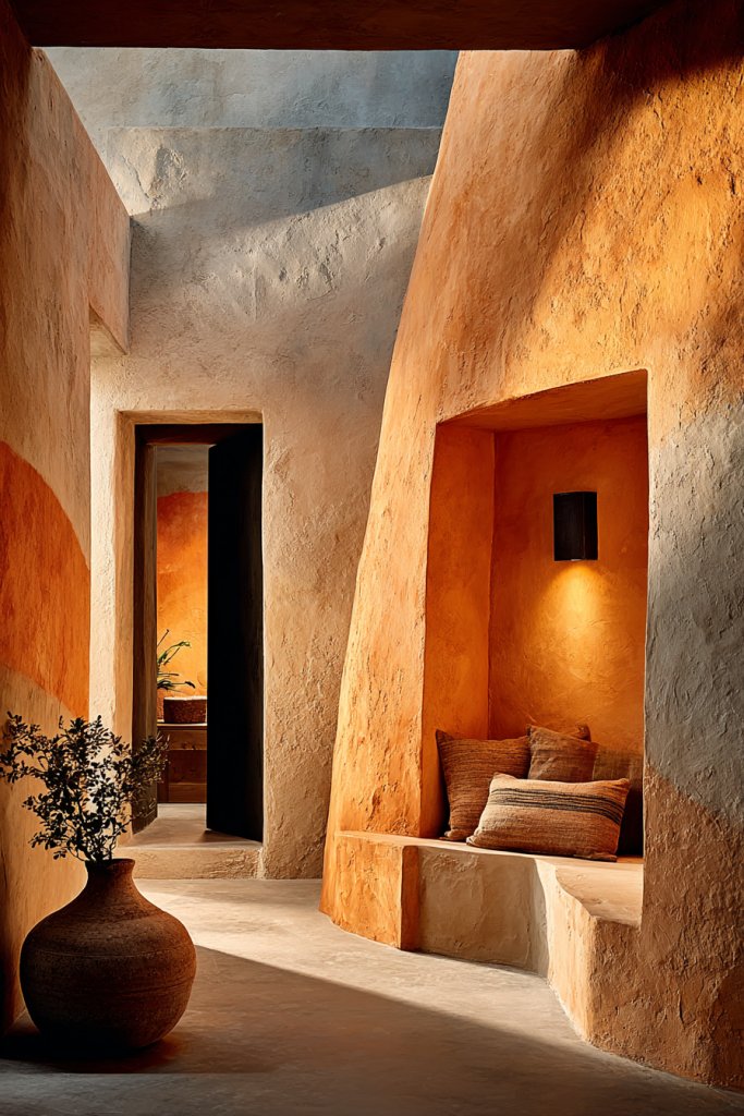 Imagine walls painted in warm, muted shades of beige, sage, or clay—colors inspired by nature. The matte finish diffuses light softly, giving the room a cozy, inviting glow. The texture of the paint feels smooth and velvety, free of chemical odors. In a well-lit room, these tones evoke a sense of serenity, like a quiet forest or a peaceful desert landscape. The overall ambiance is soothing, natural, and free from synthetic overtones.