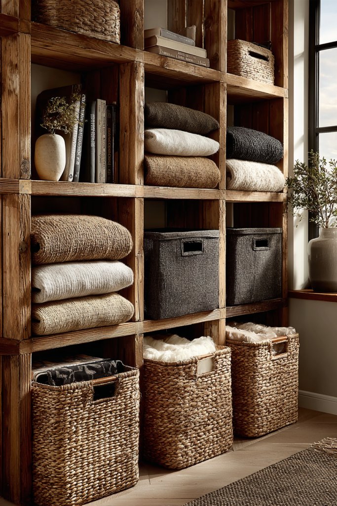 Picture woven baskets made from seagrass or bamboo, neatly stacked on open shelves. Recycled wood crates hold your books or linens, adding warmth and texture. Soft fabric bins from organic cotton or recycled polyester sit tucked under beds or in closets. The overall look is natural, organized, and inviting—each piece telling a story of sustainability. The arrangement creates a calming flow, making tidying up feel less like a chore and more like a design statement.
