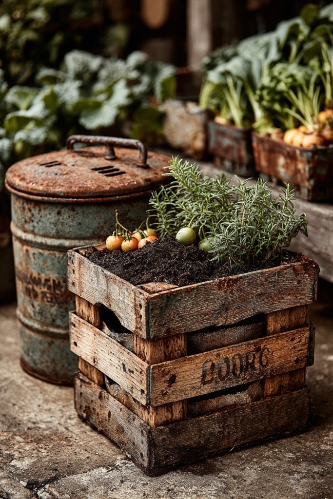 Visualize a cozy corner in your backyard or balcony with a repurposed recycled bin—perhaps a vintage metal drum or a wooden crate lined with compostable liners. Inside, vegetable peels, coffee grounds, and garden clippings decompose into dark, crumbly soil. A simple vented lid allows airflow, preventing odors. Herbs and vegetables nearby thrive thanks to your eco-conscious effort. The whole setup feels natural, functional, and connected to the cycle of life.