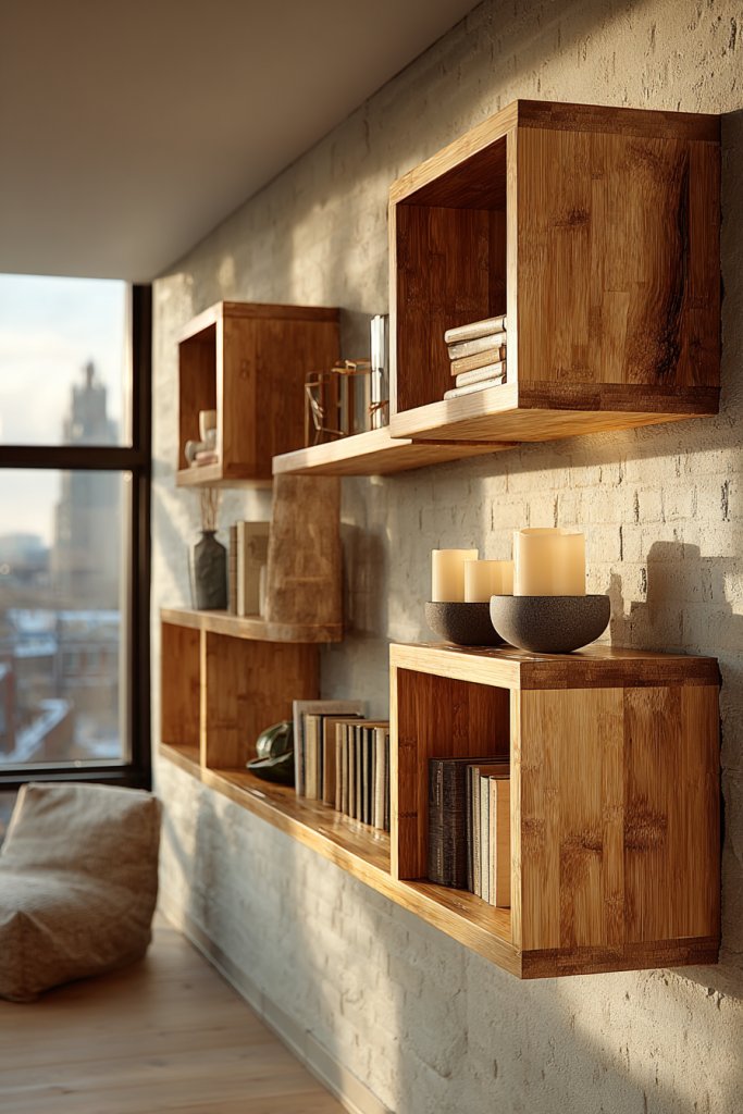 Imagine sleek bamboo shelving units mounted on a wall, their light, golden hue contrasting beautifully with modern or rustic decor. The surfaces are smooth yet textured, with visible grain patterns adding visual interest. Bamboo furniture like stools, tables, or beds exudes a minimalist, organic charm. The natural fibers catch the light, creating a warm glow that makes the room feel fresh and inviting. It’s a look that’s both modern and rooted in nature.