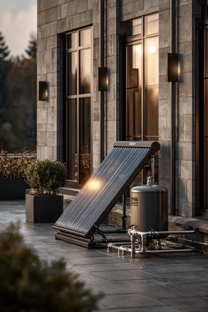 Picture a sleek solar thermal collector mounted on your roof, angled perfectly to catch the sunlight. The system includes insulated pipes leading to your water tank, which looks modern and unobtrusive. During sunny days, the collector glows with warmth, with heat visibly transferring into the tank. At night or cloudy days, the system seamlessly switches to backup energy. The whole setup feels innovative yet natural—integrating technology with sustainability.