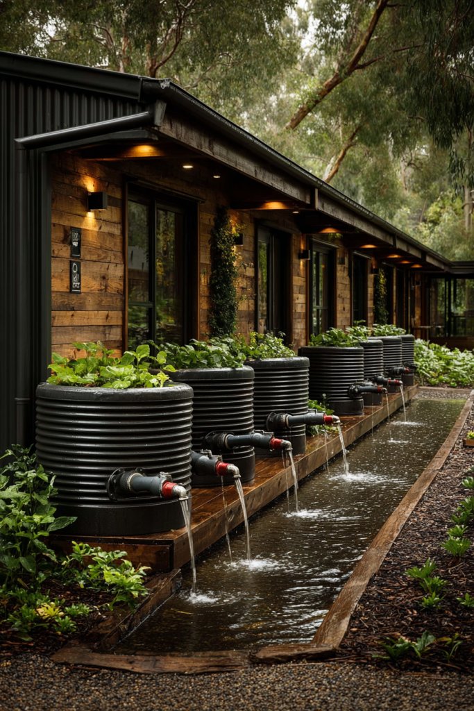 Picture a series of large, recycled plastic or metal barrels positioned beneath your roof gutters, connected with pipes and valves. During a rainstorm, the system fills with crystal-clear water, ready for use. A spigot makes it easy to fill watering cans or connect hoses directly. The setup is functional yet unobtrusive, blending into your eco-friendly landscape. The rainwater gently flows into your garden beds, nourishing your plants naturally and sustainably.