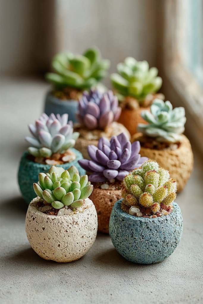 Imagine a collection of small, sculptural succulents arranged on a windowsill or tabletop, their fleshy leaves in shades of green, purple, and blue. The pots are made from recycled ceramics, concrete, or reclaimed wood, adding texture and eco-conscious charm. The plants’ geometric forms and soft colors create a calming, modern aesthetic. When sunlight hits them, they seem to glow with vitality, turning your space into a mini desert oasis that’s both stylish and sustainable.