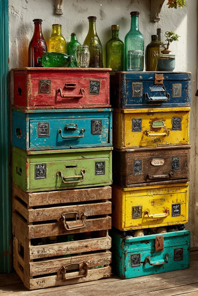 Imagine a tall, narrow wall-mounted setup with repurposed tin cans, glass bottles, or wooden crates stacked vertically. Each container is labeled with eco-friendly tags or painted with chalkboard paint for easy reuse. The arrangement is neat, colorful, and inspiring—transforming a mundane task into a decorative feature. The containers hold paper, plastics, or metals, all within easy reach, encouraging regular recycling. It’s a sustainable, artistic way to organize your waste.
