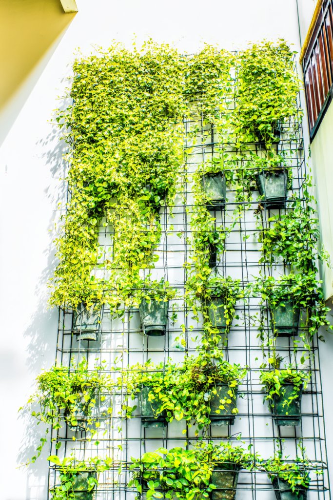 Visualize a wall-mounted trellis or panel system filled with climbing vegetables, flowers, or decorative vines. The lush greenery climbs upward, creating a living tapestry of color and texture. The backdrop of your yard is transformed into a green wall that’s both functional and beautiful. Small pots or planters add depth, and the overall effect is a lush, eye-catching feature.