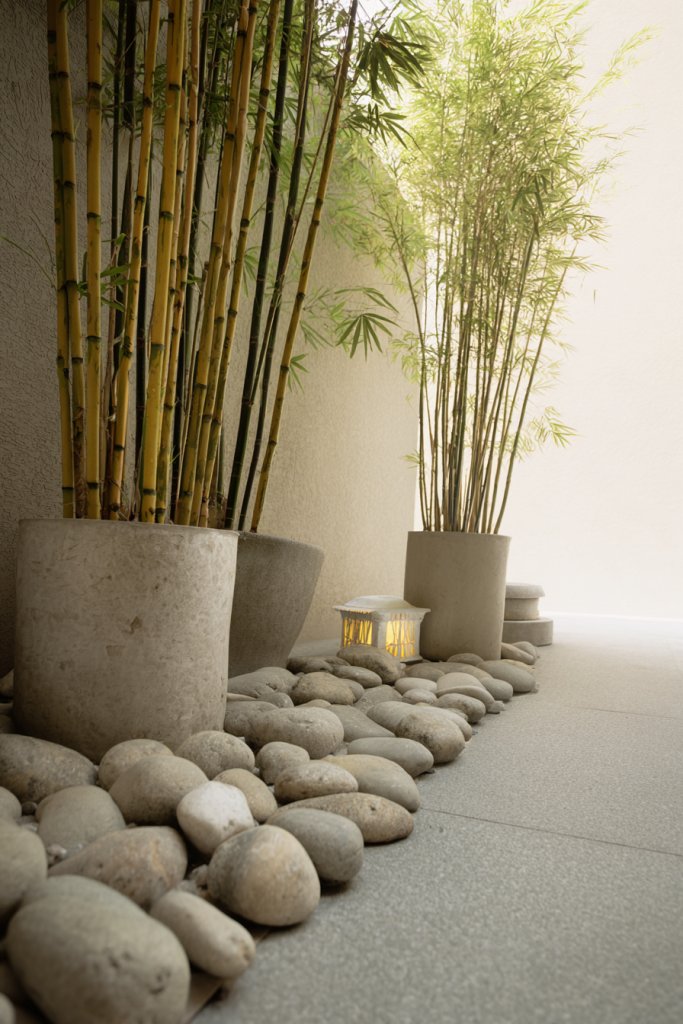 Picture a small, gravel-filled area with smooth pebbles arranged in patterns. Tall bamboo fencing or screens provide privacy, while a minimalist stone lantern or sculpture adds focal interest. A simple seating area with a weatherproof cushion or mat invites you to sit and breathe. The gentle sounds of flowing water or rustling bamboo complete the tranquil scene.