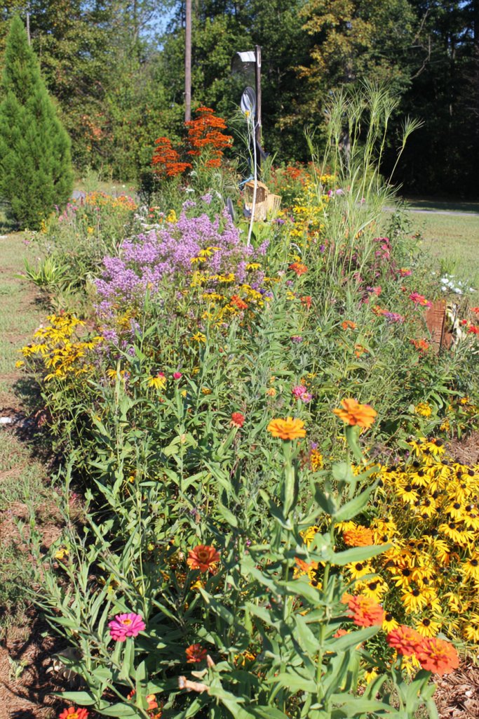 Visualize a lush patch filled with nectar-rich flowers and native plants—think coneflowers, milkweed, and goldenrod. Bright butterflies flit from bloom to bloom, while bees buzz busily around. The garden is alive with movement and color, a true celebration of nature’s pollination process. Small decorative elements like butterfly stakes or colorful rocks add charm without clutter.