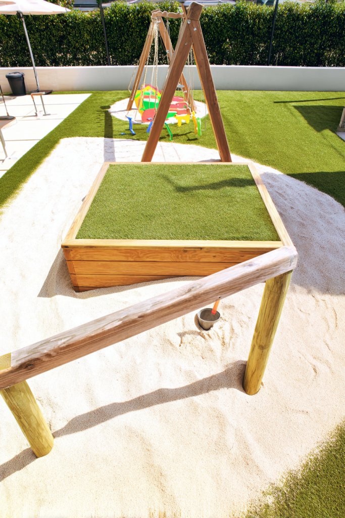 Imagine a square or circular raised platform made of wood or composite, filled with soft sand or turf. Kids dig and build castles, while nearby, a small playhouse or outdoor toys add charm. The area is bordered with neat wood or stone, keeping it contained. Bright, cheerful colors and textured surfaces create an inviting, playful scene. Laughter echoes as children dig, scoop, and explore.