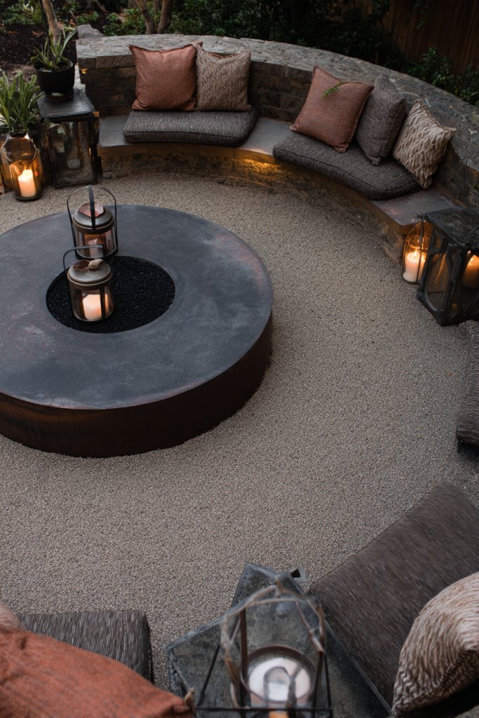 Picture a circular fire pit made of natural stone, with plush, weather-resistant cushions arranged around it. The flickering flames cast a warm glow, while string lights overhead add a touch of magic. The scent of wood smoke mingles with the crisp evening air. Everyone is relaxed, wrapped in blankets, enjoying the crackling fire and each other’s company.