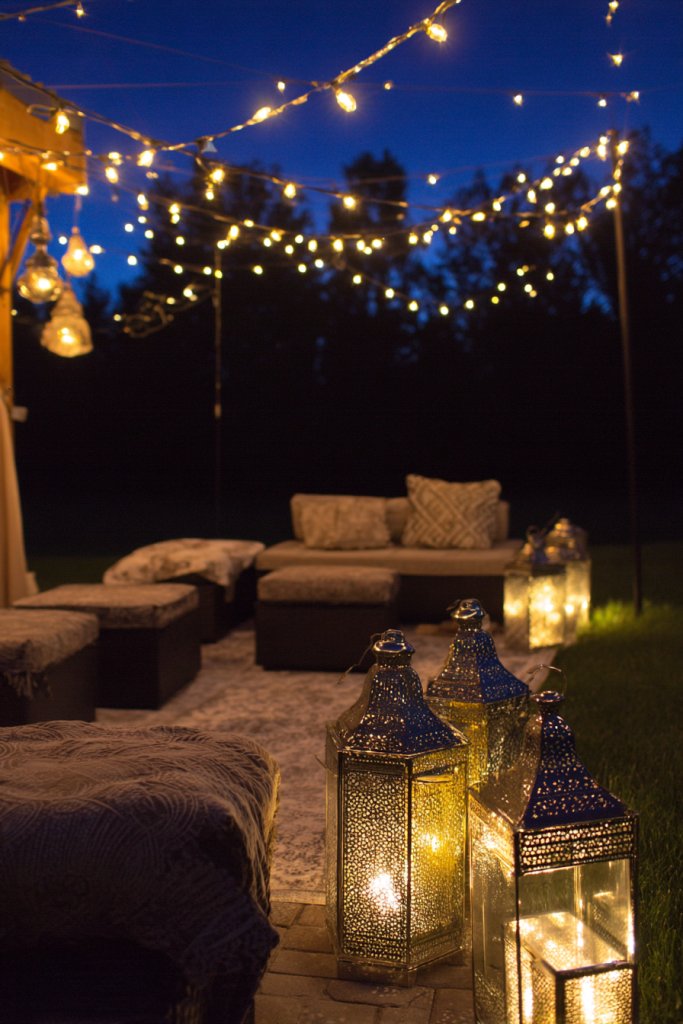Picture warm string lights draped across trees or pergolas, casting a gentle glow. Lanterns of different sizes and styles hang from hooks or stand on tables, flickering softly. The combined glow creates an intimate, enchanting atmosphere. Shadows dance on the ground, and the yard becomes a cozy haven for conversations or stargazing. The scene is warm, inviting, and perfect for evening relaxation.