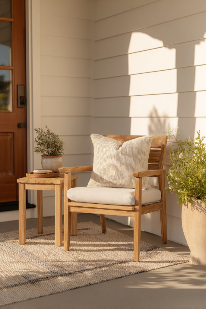 Picture a small, inviting bench or a pair of outdoor chairs with plush cushions and a side table, nestled under a porch or by the front door. Add a weather-resistant throw or decorative pillows to enhance comfort and style. Surround the area with potted plants or lanterns for ambiance. It’s a little oasis that welcomes visitors and adds charm.