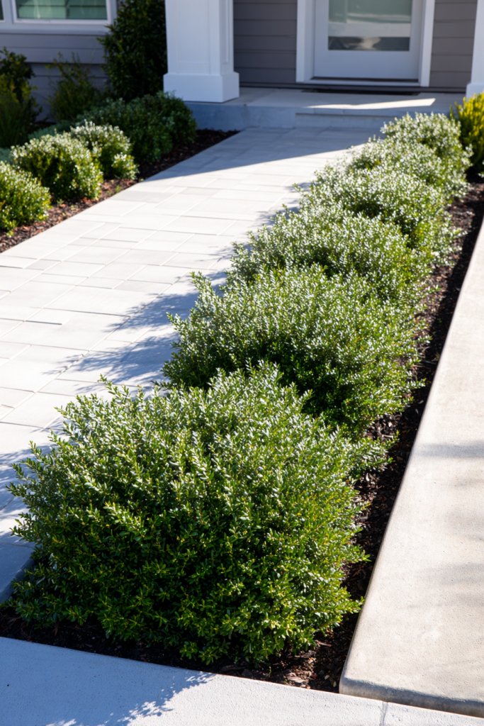 Picture a neatly trimmed hedge or a row of evergreen shrubs lining your walkway, providing structure and greenery without constant pruning. The shrubs’ subtle textures and muted colors complement your home’s facade, creating a seamless transition from yard to house. Mulched beds or gravel pathways add to the clean, low-maintenance look. Seasonal flowers or berries can add slight pops of color.