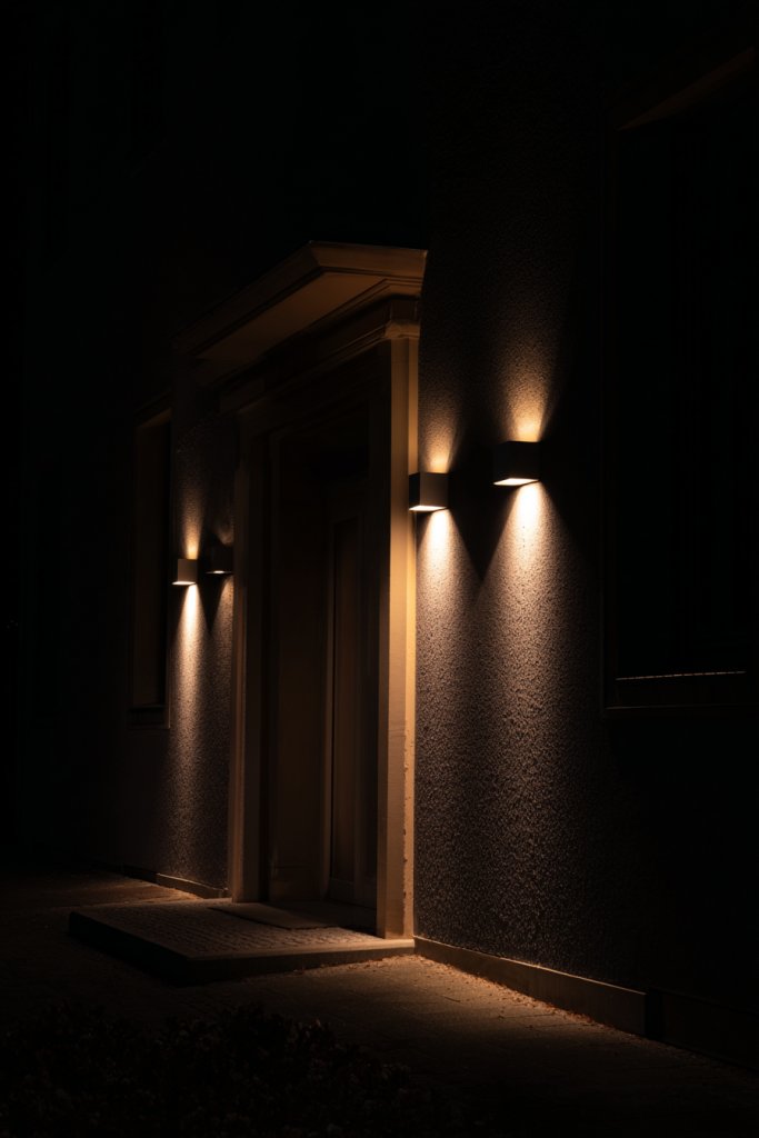 Imagine a pair of sleek wall sconces flanking your front door, casting soft, warm light that accentuates the entryway’s details. Complement that with a pendant or hanging lantern in a modern or vintage style for added character. Pathway lights guide visitors smoothly to your doorstep, while subtle ground lighting highlights landscaping features. The overall effect is cozy, welcoming, and sophisticated.