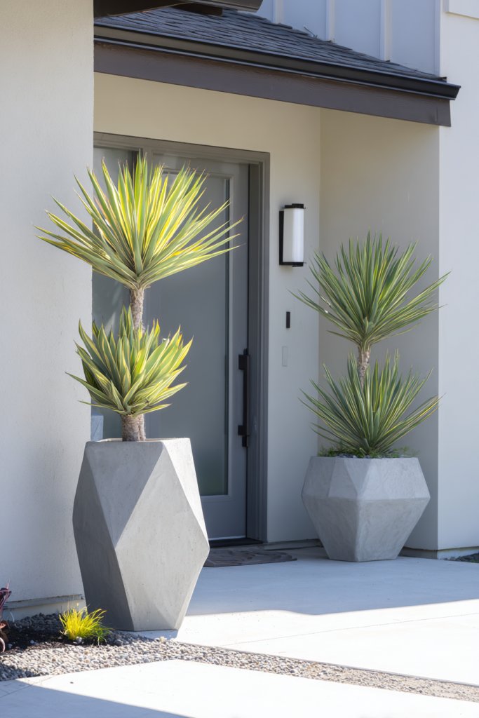 Imagine large, geometric concrete or metal planters with sculptural succulents, yucca, or agave. The striking shapes and textures contrast with the smooth exterior walls, creating a modern, artistic vibe. The plants’ architectural forms, like spiky leaves or rosette shapes, add depth and dimension. Lighting can cast dramatic shadows, enhancing their visual appeal.