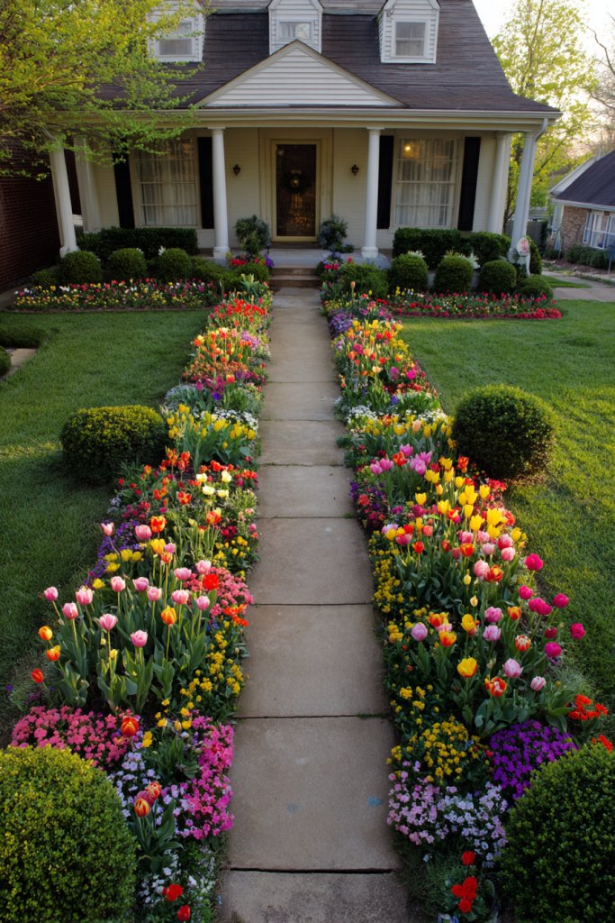 Picture two lush flower beds flanking your front door, each filled with seasonally vibrant blooms like tulips, petunias, or marigolds. The beds mirror each other perfectly, with symmetrical borders, mulch, and matching plant heights. The flowers add a burst of color that draws visitors’ eyes inward, framing the entrance beautifully. Well-maintained lawns and edging complete the look.
