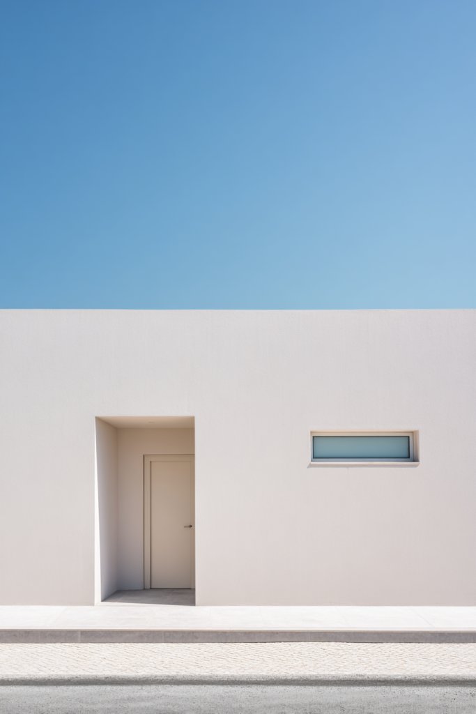 Visualize a facade with smooth, unadorned surfaces in shades of white, beige, or gray. The design relies on simple geometric forms—flat walls, rectangular windows, and subtle detailing—without clutter or ornamentation. The focus is on proportion, balance, and material quality. Natural light plays a big role in emphasizing the purity of the design.