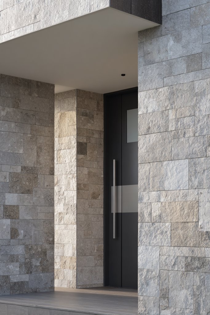 Visualize sleek, large-format stone panels in shades of gray, beige, or charcoal installed around your porch or entire front wall. The stones are smooth yet textured, creating a sophisticated contrast against flat surfaces. The natural variations in stone color and pattern add richness, making your home stand out effortlessly. Ambient lighting accentuates the textured surface at night.