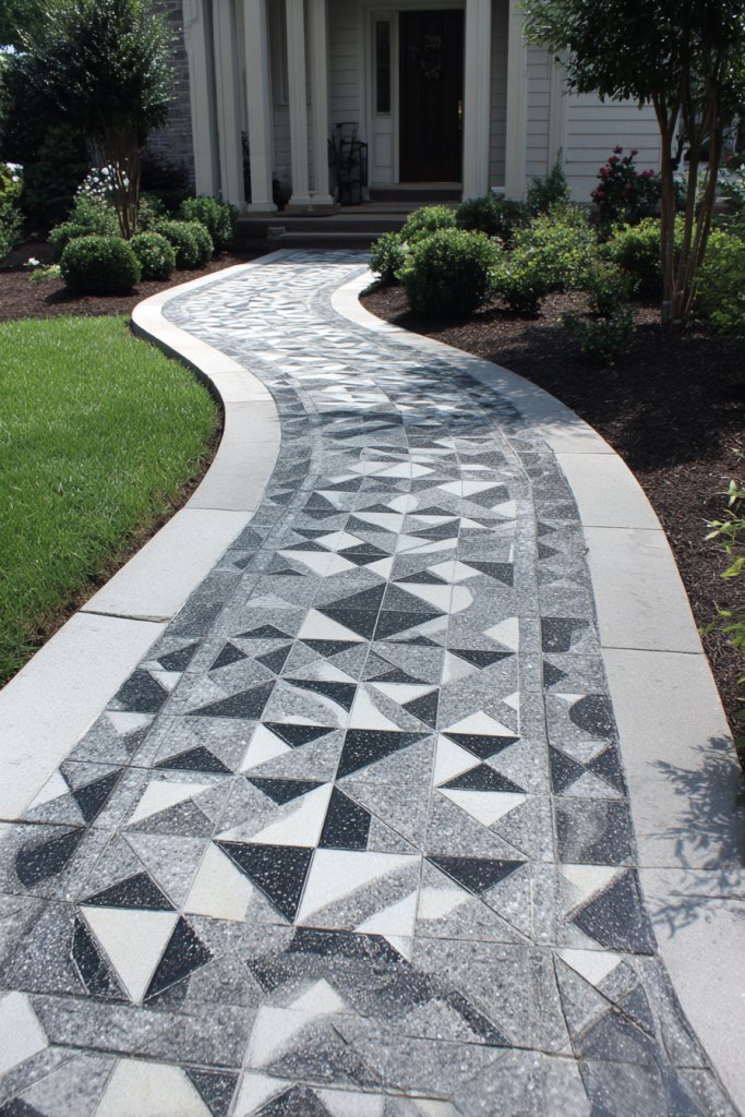 Picture a winding pathway made from interlocking pavers in geometric patterns—like herringbone, basket weave, or circular motifs. The choice of colors, such as warm earth tones or contrasting hues, adds depth and interest. The textured surface provides a tactile experience, and the pattern guides visitors naturally toward the entrance. Surrounding greenery or gravel accentuates the design.