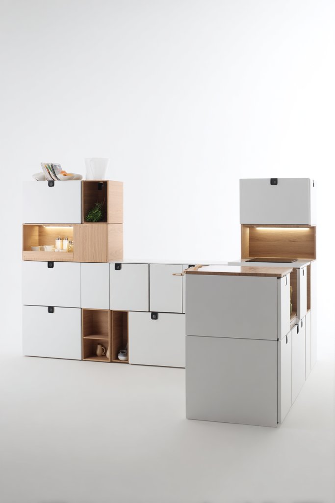 Imagine a series of sleek, stackable units—cabinets, islands, or open shelves—that can be rearranged in countless configurations. The modules are finished in neutral tones like matte gray or wood veneer, blending seamlessly with various styles. You can start with a basic arrangement, then expand or reconfigure as your needs evolve, maintaining a cohesive, modern look. The entire setup feels flexible yet polished.