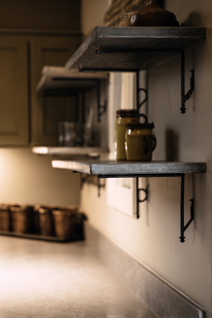 13. Vintage-Inspired Open Shelves with Modern Hardware