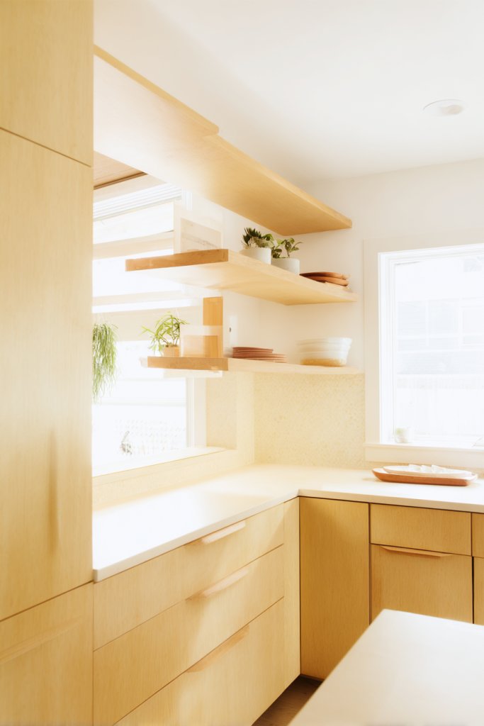 18. Scandinavian-Style Light Wood Cabinets and Open Shelves