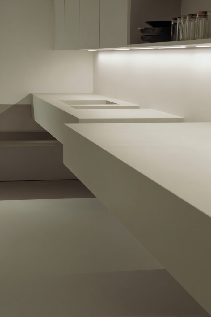 Imagine a smooth, seamless countertop seemingly floating above open shelves or cabinets. The surface is a polished stone or composite, with the underside fitted with open shelves or racks for utensils, pots, or small appliances. The minimalist design emphasizes clean lines and openness, with hidden brackets supporting the structure. Soft lighting underneath adds warmth and highlights the floating effect.