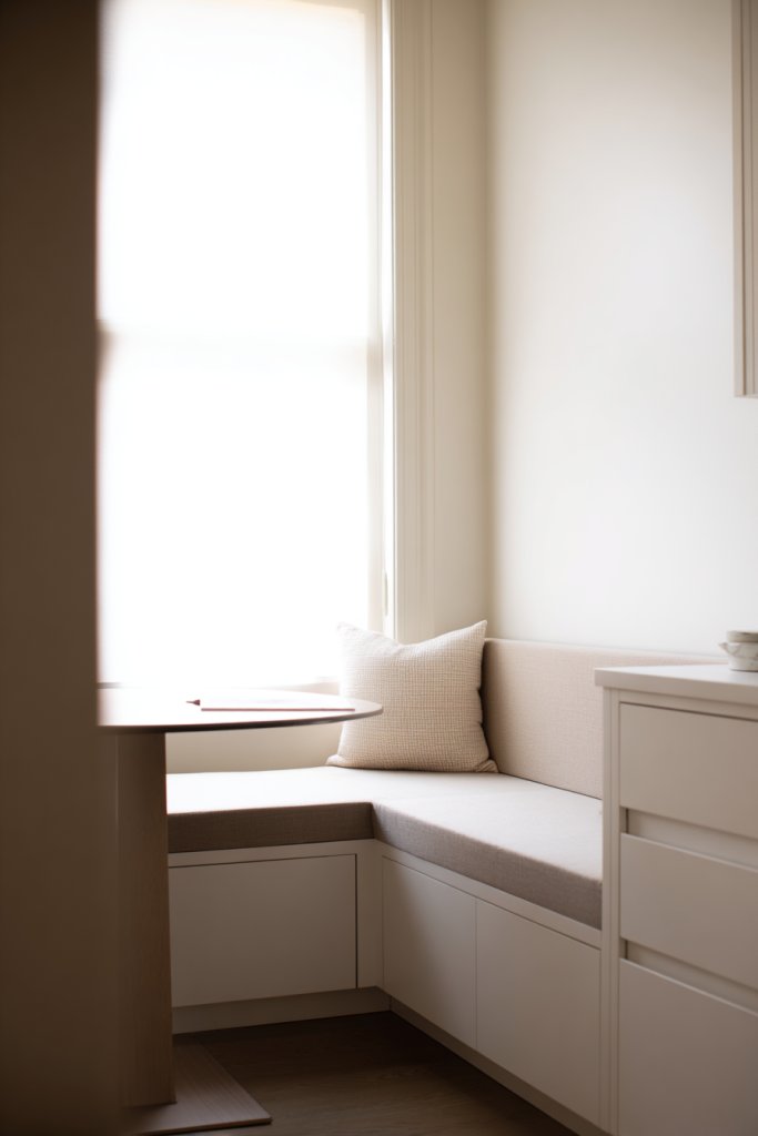Picture an L-shaped upholstered bench snugly fitted into a corner, with a soft cushion and decorative pillows. Beneath the seating, hinged or pull-out drawers store linens, utensils, or even small appliances. A small, round or rectangular table completes the setup, creating an inviting dining spot. The furniture’s design blends comfort with practicality, making the most of every inch.