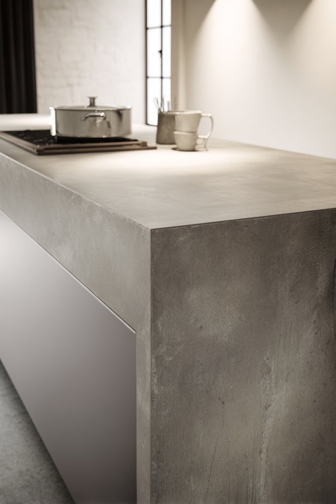 Visualize a sleek concrete countertop with a matte finish, paired with minimalist cabinetry and metal accents. The surface is spacious, with subtle variations in color and texture that add character. It’s complemented by simple pendant lighting and industrial-style hardware, creating an urban loft feel. The raw material pairs well with natural wood or stainless steel accessories.