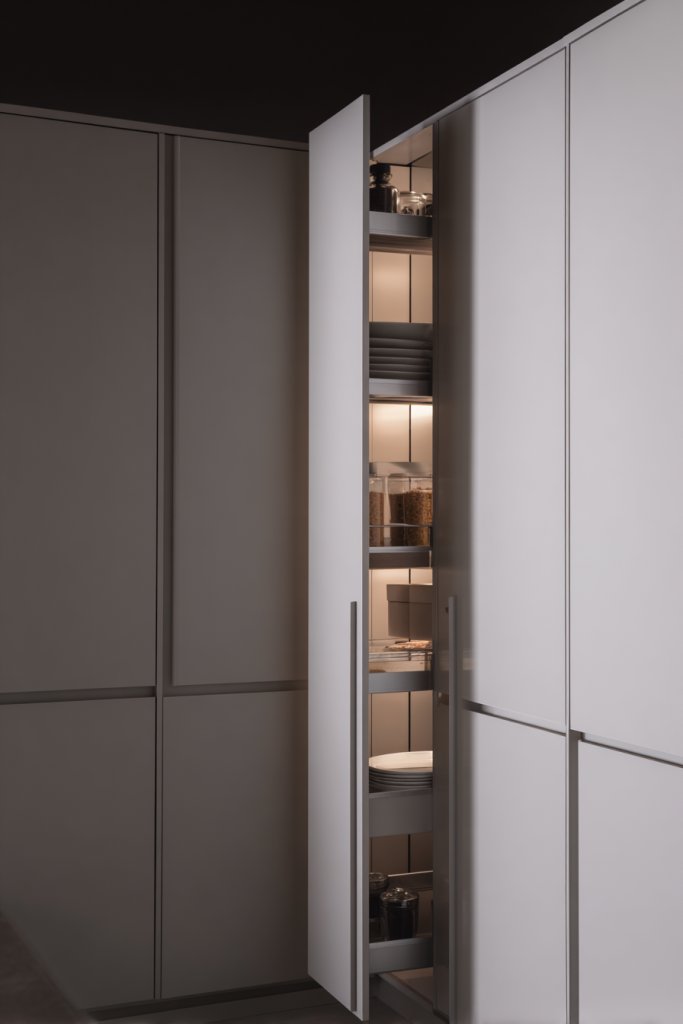 Visualize a tall, multi-tiered pantry with sliding doors that glide smoothly open to reveal neatly arranged shelves. Each level is dedicated to a different category—baking supplies, canned goods, snacks—making everything accessible. The sliding doors save space, especially in tight corners, and the sleek finish blends seamlessly with modern decor. Inside, clear containers and labeled bins keep everything organized.