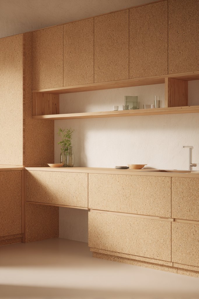 Imagine bamboo cabinets with a natural, light finish that pairs beautifully with cork accents. The textures add visual depth, creating a cozy, organic atmosphere. Shelves made from cork or bamboo are lightweight yet sturdy, holding dishes, utensils, or decorative items. Soft, natural lighting enhances their earthy appeal, making your kitchen feel warm and inviting.