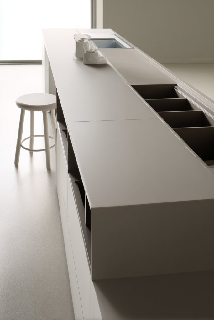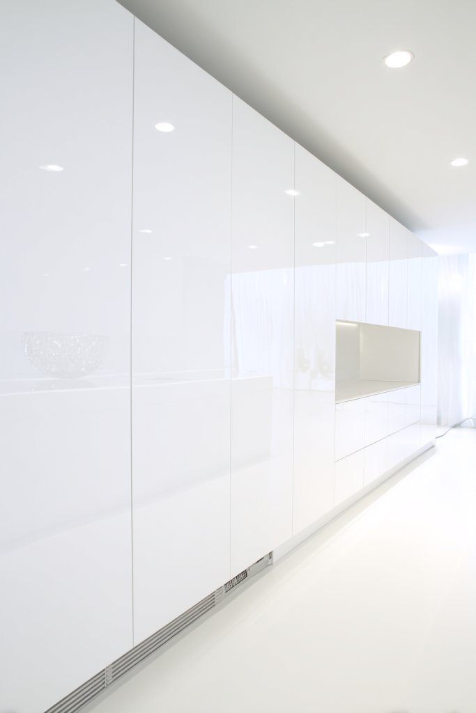 5. Minimalist White Glossy Cabinets with Hidden Handles