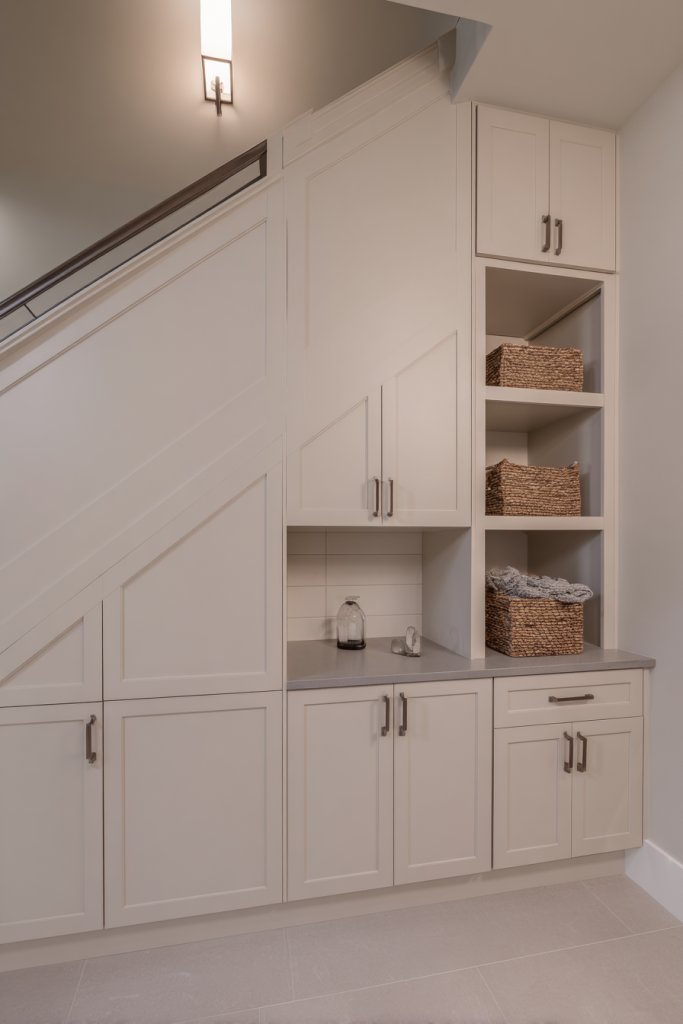 Imagine a sleek set of cabinets with a mix of drawers and open shelves that fit perfectly beneath your staircase. The finish matches your existing decor—light wood for warmth or painted in bold colors for contrast. Inside, organize everything from pantry items to cleaning supplies or even small appliances. The design is clean, integrated, and unobtrusive, making the space feel intentional.
