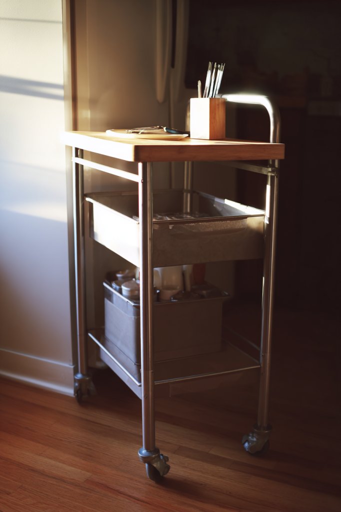 Visualize a narrow, sleek cart with a wooden top and open shelves below, rolling smoothly on casters. It’s positioned beside your stove for extra prep space, then easily moved to serve as a bar during parties. The cart’s minimalist design complements various styles, from modern to farmhouse. When not in use, you can tuck it away in a corner or behind a door, keeping your kitchen uncluttered.
