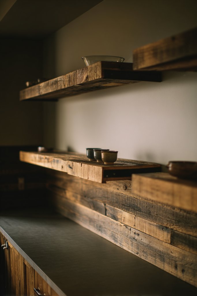 Imagine floating shelves made from weathered, reclaimed wood with natural knots and imperfections. They are mounted with minimalist brackets or hidden supports, emphasizing the wood’s natural beauty. On the shelves, you might place vintage mugs, ceramic bowls, or a collection of colorful dishware, all arranged casually. Soft lighting above highlights the wood’s grain, creating a warm glow that invites you to linger.