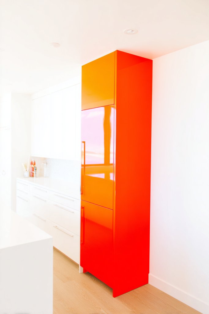 Imagine a row of vivid turquoise or fiery red cabinets standing out against neutral walls and countertops. The glossy finish catches the light, making the color even more striking. Open shelves or glass-front doors showcase colorful dishes or glassware, adding layers of visual interest. The contrast creates a lively, inviting atmosphere perfect for cooking and entertaining.