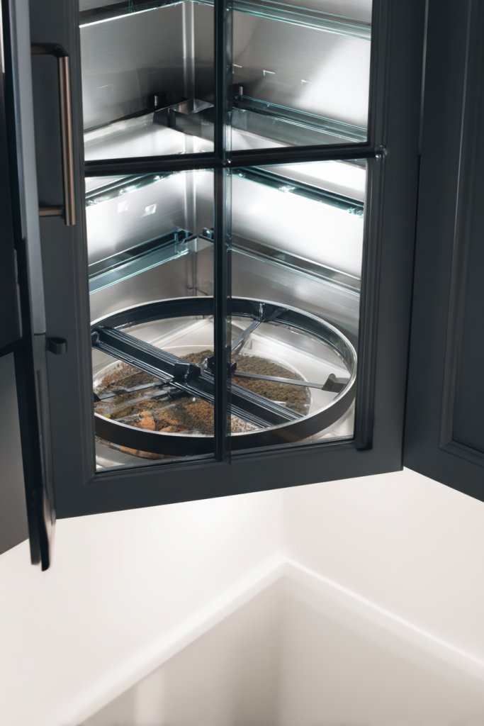 Visualize a sleek corner cabinet with a spinning lazy Susan that reveals multiple tiers of neatly arranged jars and utensils. The unit is finished in a matching cabinet color to blend seamlessly into your kitchen design. When opened, the lazy Susan rotates smoothly, bringing everything within arm’s reach. The interior is optimized with adjustable shelves, making it easy to customize.