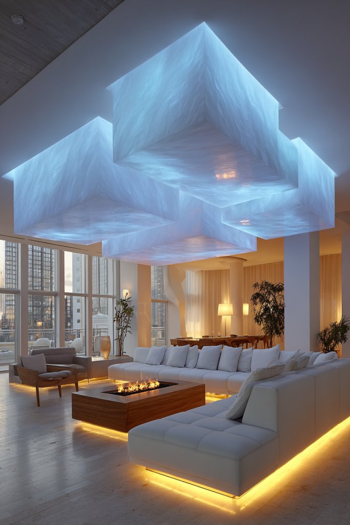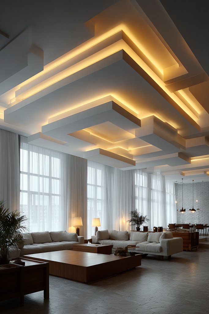 Picture a ceiling with sleek, rectangular panels suspended at varying heights, softly illuminated by hidden LED strips. The glow creates a floating illusion, adding depth and dimension. The diffused light reflects gently off the ceiling, casting a calming ambiance. It’s like your ceiling becomes a giant, ambient light sculpture, blending form and function seamlessly.