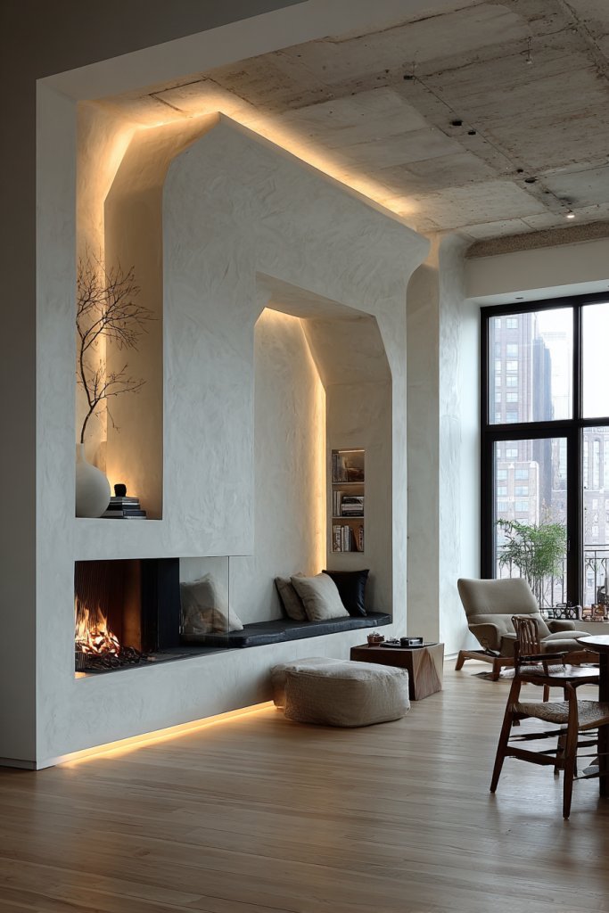 Want to add subtle architectural detail that elevates your living room? Recessed niches or indentations with hidden accent lighting provide a sophisticated, layered look. They add visual interest without cluttering the space, perfect for minimalist or modern interiors.