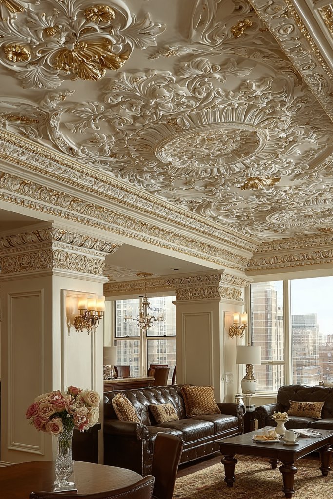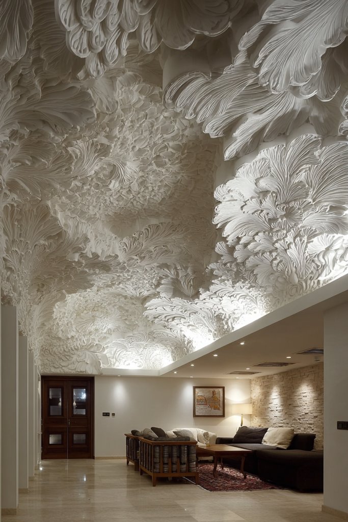 Visualize a ceiling adorned with intricate plaster relief patterns or sculptural wall panels that extend across the surface. The three-dimensional textures catch light and shadow, creating an ever-changing play of visuals. It’s like turning your ceiling into a gallery of tactile art, inviting viewers to explore its details.