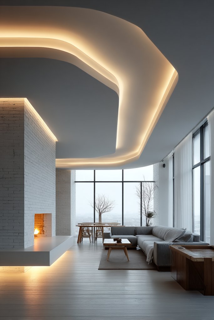 Envision a ceiling with shallow recesses that house soft, concealed LED lights. The niches create a sense of depth, while the lighting highlights their edges, casting gentle glows. This setup draws attention upward and adds a refined, curated feel. It’s like giving your ceiling a secret, glowing dimension that’s both elegant and understated.