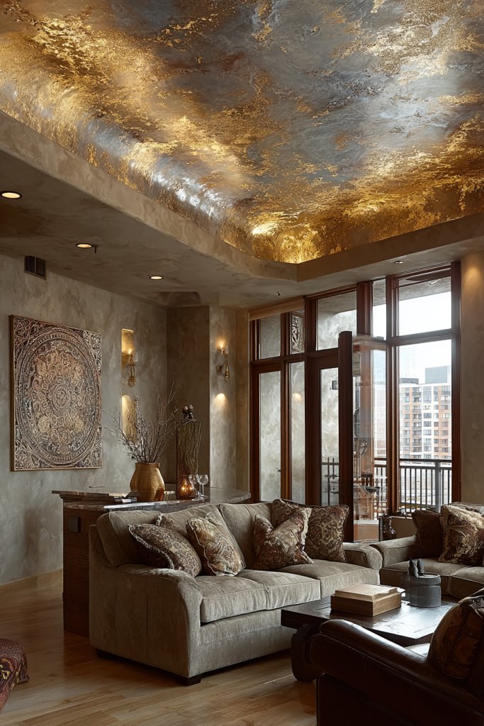 Dreaming of a ceiling that screams luxury without the hefty price tag? Metallic foil or leaf accents add a subtle shimmer that instantly elevates any room. They’re perfect for those wanting to introduce a touch of opulence with minimal fuss.