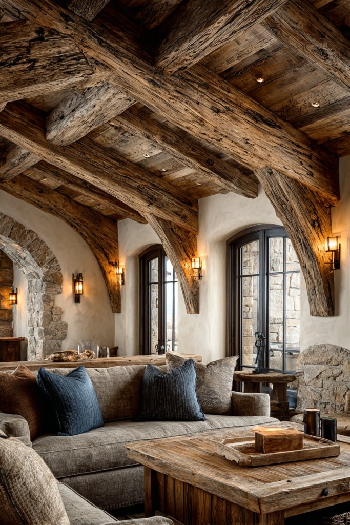 Picture beams with deep, rich stain running across a high, vaulted ceiling. The natural grain and knots in the wood add texture and authenticity. When paired with warm lighting, the beams cast gentle shadows that enhance the room’s depth. It’s like bringing a piece of the countryside into your urban home, but with modern comforts.