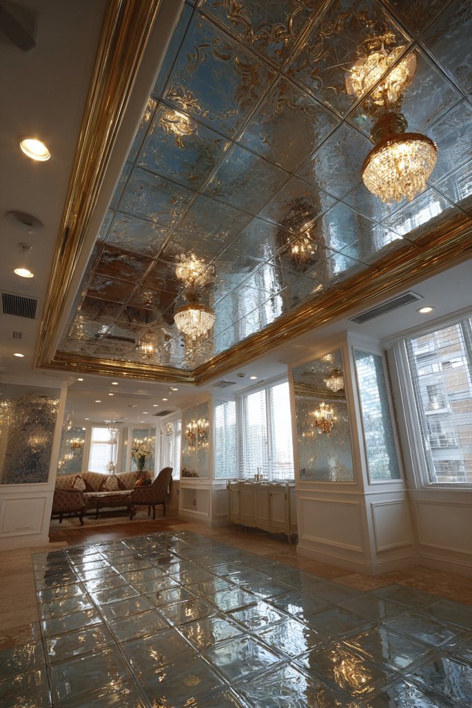 6. Mirrored Ceiling Panels to Expand Space and Add Glamour