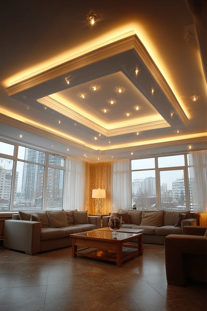 Picture a recessed ceiling with soft cove lighting along the edges, casting a warm glow inward. The central part of the ceiling is slightly lower, framed by moldings or trim, creating a visual ‘tray’ effect. The layered lighting adds warmth and highlights the architectural detail, making the ceiling the room’s focal point. It’s like giving your ceiling a gentle hug of light.