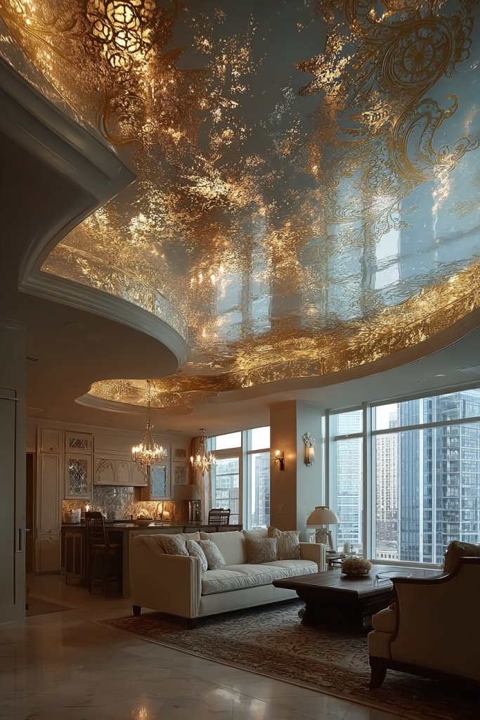 Visualize sections of your ceiling covered in delicate gold or silver leaf, shimmering as light hits them. The reflective surfaces catch ambient light, creating a glow that makes the room feel richer. These accents can be applied in intricate patterns or as a simple highlight, adding a luxe touch that’s both understated and striking. It’s like adding jewelry to your ceiling.