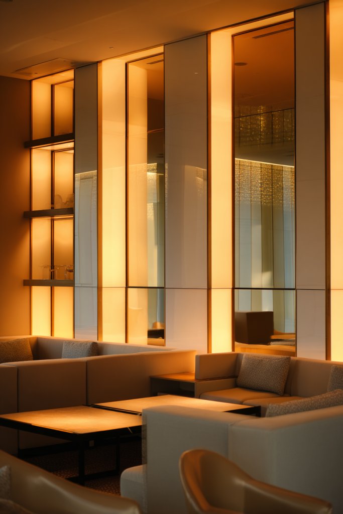 Picture a large, open room divided by sleek, mirrored panels that act as walls. The reflective surfaces bounce light back into each zone, creating a seamless flow and visual continuity. When you move from one area to another, the reflection gives the illusion of a larger, more connected space. It’s like having a stylish, invisible wall that enhances your home’s openness.